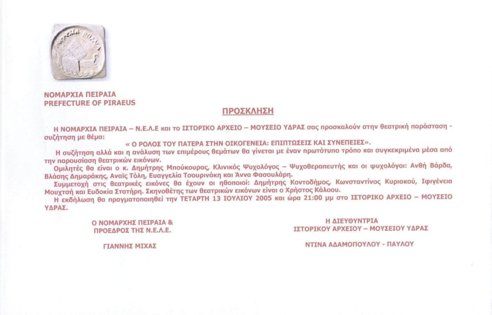 Θεατρική Παράσταση – Συζήτηση με θέμα: «Ο ΡΟΛΟΣ ΤΟΥ ΠΑΤΕΡΑ ΣΤΗΝ ΟΙΚΟΓΕΝΕΙΑ: ΕΠΙΠΤΩΣΕΙΣ ΚΑΙ ΣΥΝΕΠΕΙΕΣ»