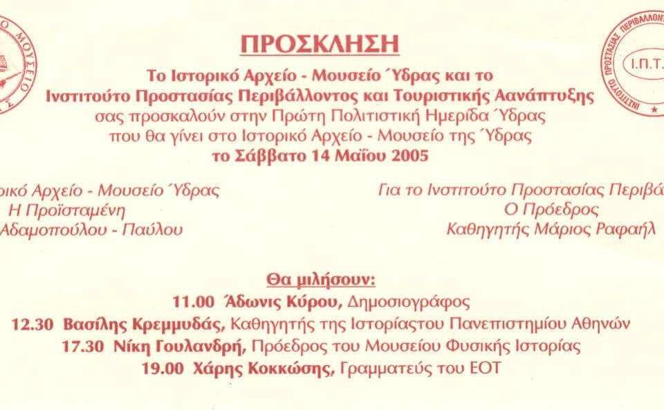 1η ΠΟΛΙΤΙΣΤΙΚΗ ΗΜΕΡΙΔΑ ΥΔΡΑΣ ΟΜΙΛΗΤΕΣ: ΑΔΩΝΙΣ ΚΥΡΟΥ, Δημοσιογράφος ΒΑΣΙΛΗΣ ΚΡΕΜΜΥΔΑΣ, Καθηγητής της Ιστορίας του Πανεπιστημίου Αθηνών ΝΙΚΗ ΓΟΥΛΑΝΔΡΗ, Πρόεδρος του Μουσείου Φυσικής Ιστορίας ΧΑΡΗΣ ΚΟΚΚΩΣΗΣ, Γενικός […]