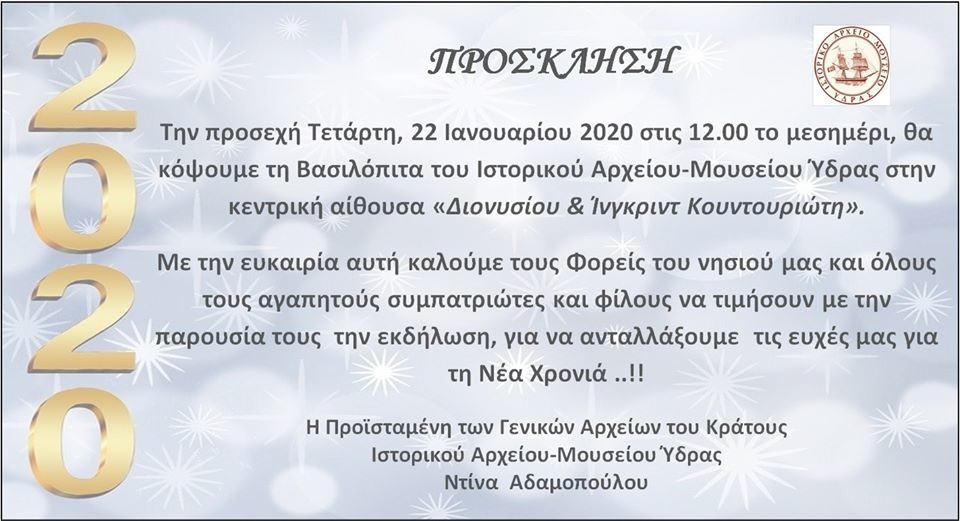ΙΣΤΟΡΙΚΟ ΑΡΧΕΙΟ – ΜΟΥΣΕΙΟ ΥΔΡΑΣ ΔΕΛΤΙΟ ΤΥΠΟΥ Το Ιστορικό Αρχείο και Μουσείο Ύδρας, φορέας παράδοσης και πολιτισμού, μετέχει πάντα σε εκδηλώσεις που προάγουν τη συλλογική μνήμη […]