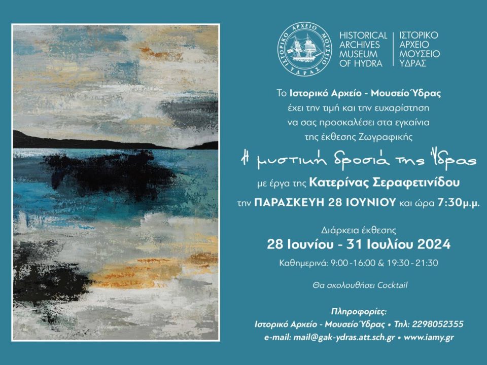28/06/2024-31/07/2024 Στο ΓΑΚ/Ιστορικό Αρχείο-Μουσείο Ύδρας θα εγκαινιαστεί η έκθεση της Κατερίνας Σεραφετινίδου με τίτλο Η μυστική δροσιά της Ύδρας, την Παρασκευή 28 Ιουνίου 2024, στις 19:30. […]