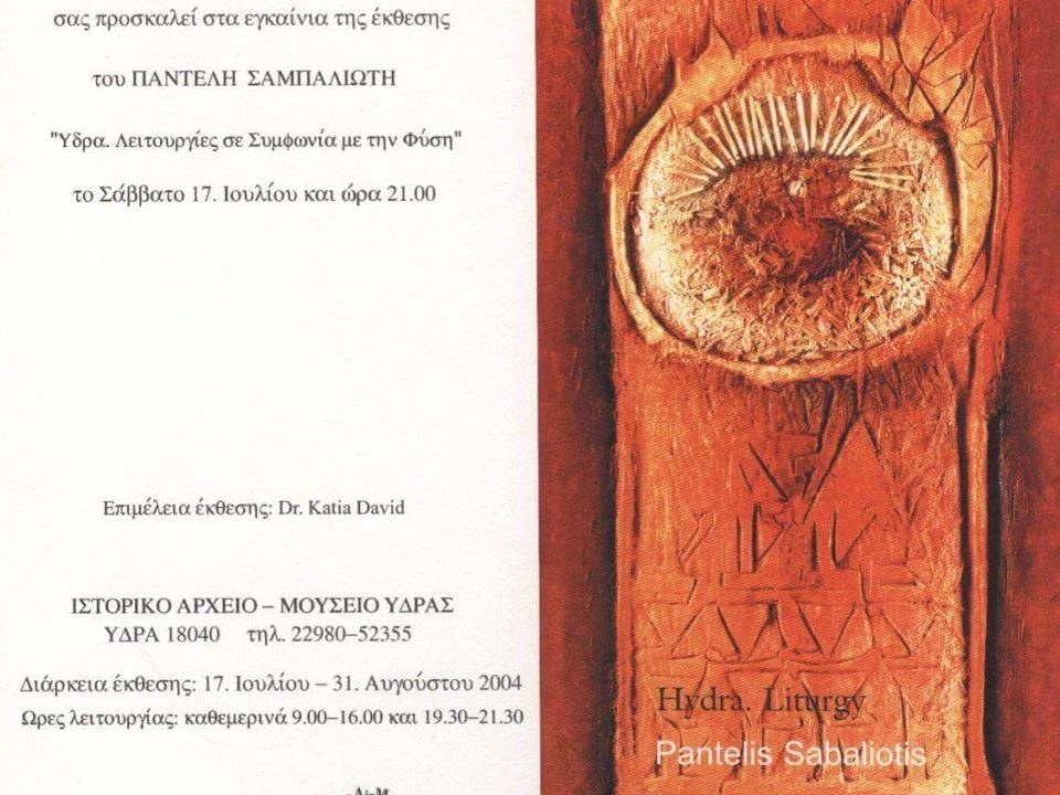 20 Οκτωβρίου, 2014Published by efstraatios at 20 Οκτωβρίου, 2014Categories 2004 Εικαστικές Εκθέσεις Εκθέσεις ΑρχειοΈκθεση ζωγραφικής ΠΑΝΤΕΛΗΣ ΣΑΜΠΑΛΙΩΤΗΣ «Ύδρα. Λειτουργίες σε Συμφωνία με την Φύση»17 ΙΟΥΛΙΟΥ – 31 ΑΥΓΟΥΣΤΟΥ 2004