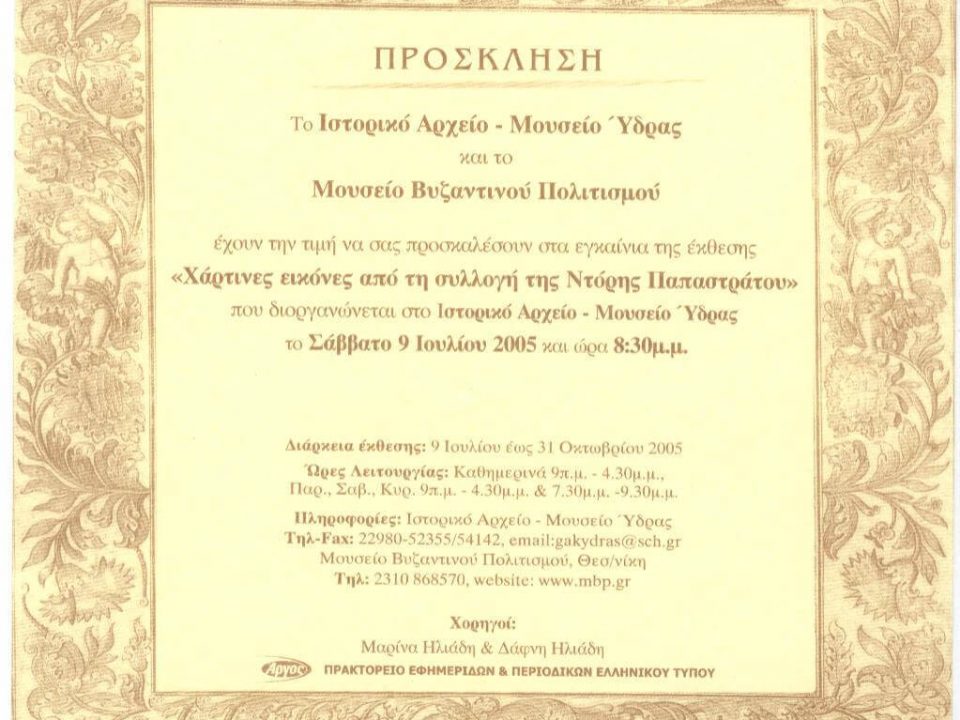 21 Οκτωβρίου, 2014Published by efstraatios at 21 Οκτωβρίου, 2014Categories 2005 Εικαστικές Εκθέσεις Εκθέσεις ΑρχειοΈκθεση μουσειακού υλικού «Χάρτινες εικόνες από τη συλλογή της Ντόρης Παπαστράτου» [Με τη συνεργασία του Μουσείου Βυζαντινού Πολιτισμού Θεσσαλονίκης] 28 ΜΑΪΟΥ – 31 ΑΥΓΟΥΣΤΟΥ 2005