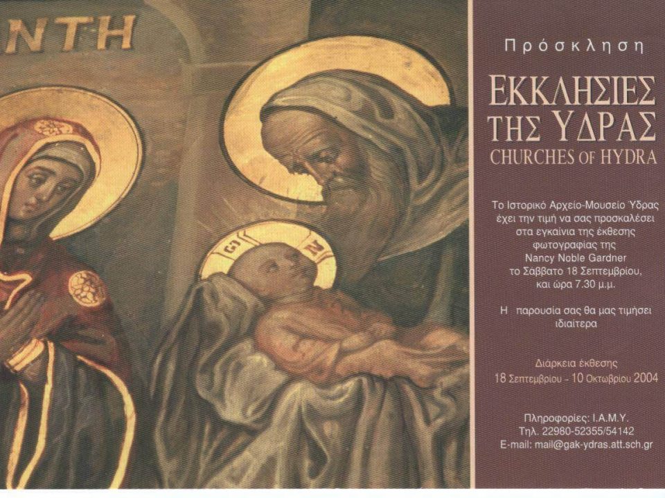 20 Οκτωβρίου, 2014Published by efstraatios at 20 Οκτωβρίου, 2014Categories 2004 Εικαστικές Εκθέσεις Εκθέσεις ΑρχειοΈκθεση φωτογραφίας Nancy Noble Gardner «ΕΚΚΛΗΣΙΕΣ ΤΗΣ ΥΔΡΑΣ» 18 ΣΕΠΤΕΜΒΡΙΟΥ – 10 ΟΚΤΩΒΡΙΟΥ 2004