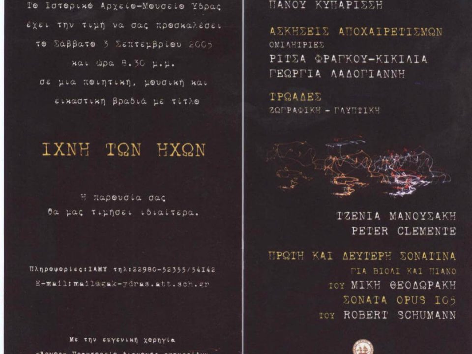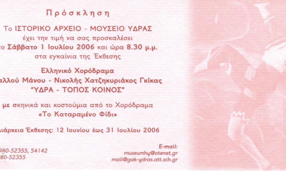 21 Οκτωβρίου, 2014Published by efstraatios at 21 Οκτωβρίου, 2014Categories 2006 Εικαστικές Εκθέσεις Εκθέσεις ΑρχειοΈκθεση με τίτλο «Ελληνικό Χορόδραμα – Ραλλού Μάνου-Νικολής Χατζηκυριάκος Γίκας : Υδρα – τόπος κοινός»12 Ιούνιου έως 31 Ιούλιου