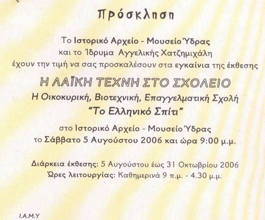 21 Οκτωβρίου, 2014Published by efstraatios at 21 Οκτωβρίου, 2014Categories 2006 Εικαστικές Εκθέσεις Εκθέσεις Αρχειο΄Εκθεση «Το ΕΛΛΗΝΙΚΟ ΣΠΙΤΙ της Αγγελικής Χατζημιχάλη», σε συνεργασία με το Ιδρυμα Αγγελική Χατζημιχάλη5 Αυγούστου έως 31 Οκτώβριου