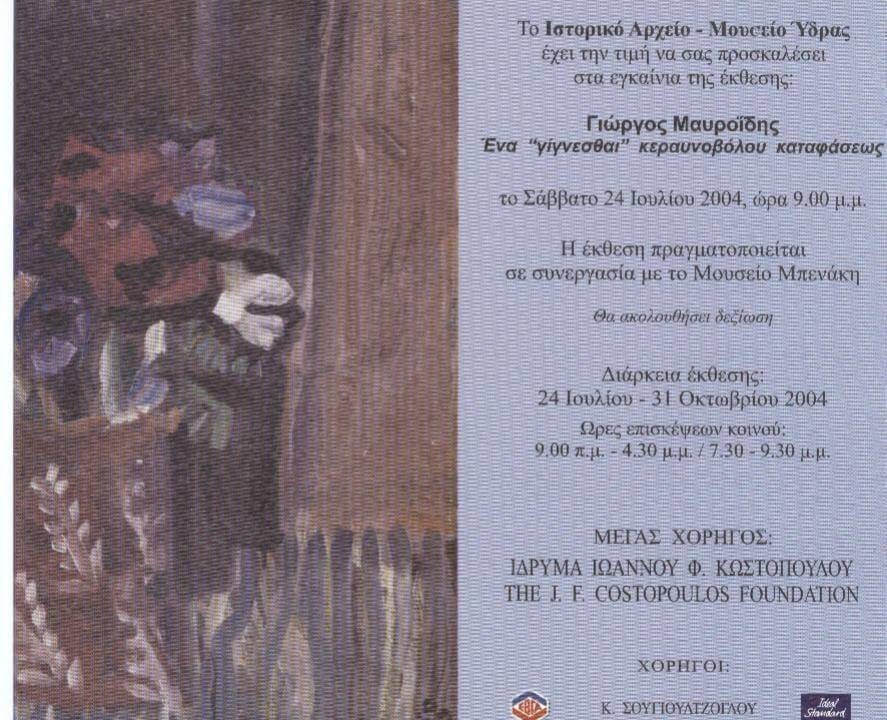 20 Οκτωβρίου, 2014Published by efstraatios at 20 Οκτωβρίου, 2014Categories 2004 Εικαστικές Εκθέσεις Εκθέσεις ΑρχειοΈκθεση ζωγραφικής: Γιώργος Μαυροϊδης Ένα “γίγνεσθαι” κεραυνοβόλου καταφάσεως. [Σε συνεργασία με το Μουσείο Μπενάκη] 24 ΙΟΥΛΙΟΥ – 31 ΟΚΤΩΒΡΙΟΥ 2004