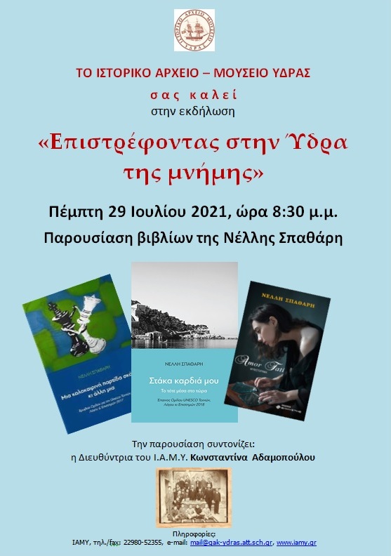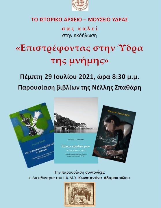 Το Ιστορικό Αρχείο – Μουσείο Ύδρας και η συγγραφέας Νέλλη Μπεγλίτη – Σπαθάρη, έχουν τη χαρά να σας προσκαλέσουν στην εκδήλωση «Επιστρέφοντας στην Ύδρα της μνήμης» […]