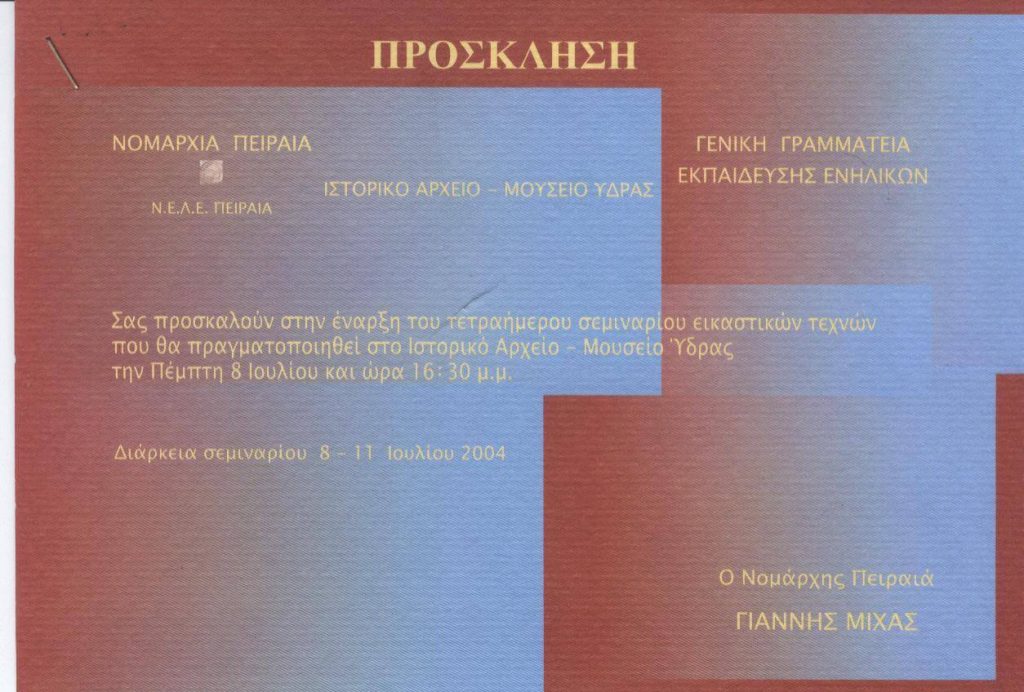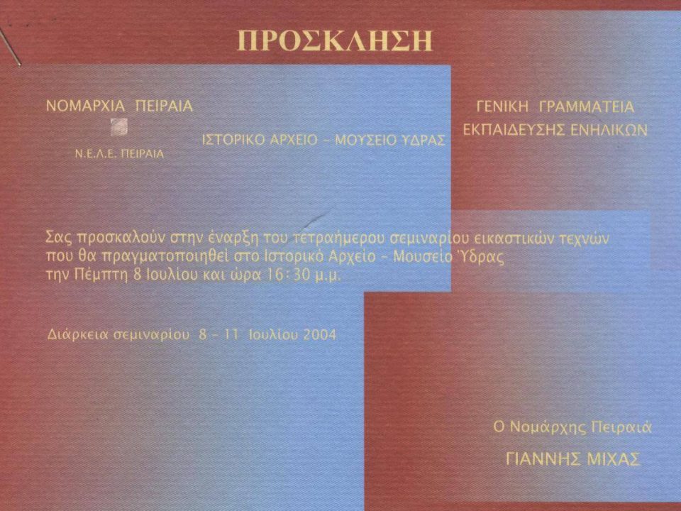 Σεμινάρια ζωγραφικής για τους ενήλικες της Ύδρας από τους καλλιτέχνες ζωγράφους Σοφία Τσιάμη και Γιάννη Μόρη από 29 Αυγούστου έως 5 Σεπτεμβρίου 2006. Τα σεμινάρια πραγματοποιήθηκαν […]