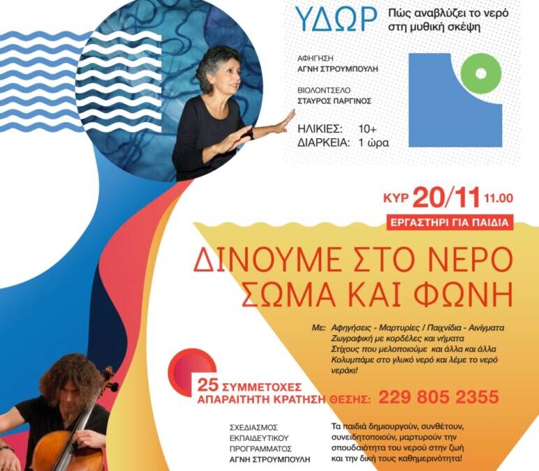 Την επόμενη ημέρα στο ΙΑΜΥ, Κυριακή 20 Νοεμβρίου, στις 11.00 το πρωί, διοργανώνεται Εκπαιδευτικό Πρόγραμμα για παιδιά, από 9 έως 14 χρόνων, με σκοπό τη γνώση για τη σπουδαιότητα του νερού στη ζωή και την καθημερινότητα. Τα παιδιά έχουν το δικό τους τρόπο να βλέπουν τη ζωή, επομένως η αντίληψή τους για το νερό θα μπορεί να συνδυαστεί με όσα θα αποκομίσουν με τα Εκπαιδευτικά Προγράμματα. Το σχεδιασμό του Εκπαιδευτικού Προγράμματος, έχει η Αγνή Στρουμπούλη. Σε αυτό οι συμμετέχοντες πρέπει να είναι σε ομάδα 25 ατόμων.