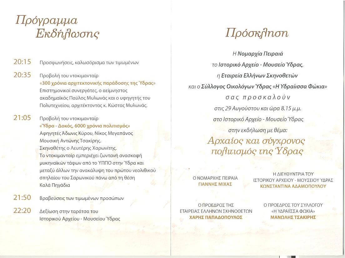 Η Νομαρχία Πειραιά, το Ιστορικό Αρχείο Μουσείο Ύδρας, η Εταιρία Ελλήνων Σκηνοθετών και ο Σύλλογος Οικολόγων Ύδρας “Η Υδραίισα Φώκια” σας προσκαλούν στις 29 Αυγούστου και ώρα 8:15 μ.μ στο Ιστορικό Αρχείο Μουσείο Ύδρας στην εκδήλωση με θέμα: “Αρχαίος και σύγχρονος πολιτισμός της Ύδρας”