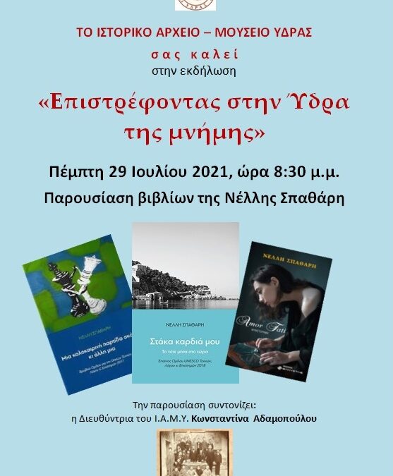 4 Αυγούστου, 2021Η εκδήλωση παρουσίασης των βιβλίων της Νέλλης Σπαθάρη η οποία αναβλήθηκε χθες λόγω του black out που συνέβη στο Νησί, θα πραγματοποιηθεί ΣΗΜΕΡΑ Πέμπτη 29 Ιουλίου 2021 και ώρα 8.30 το βράδυ στην ταράτσα του Ι.Α.Μ.Υ.