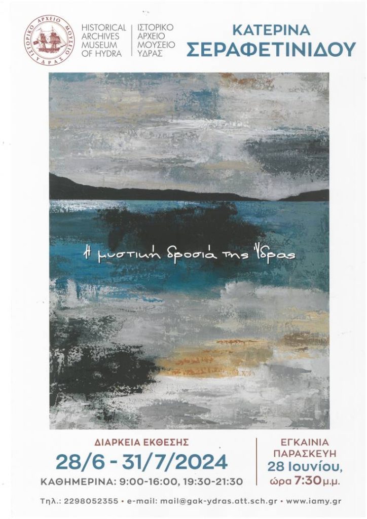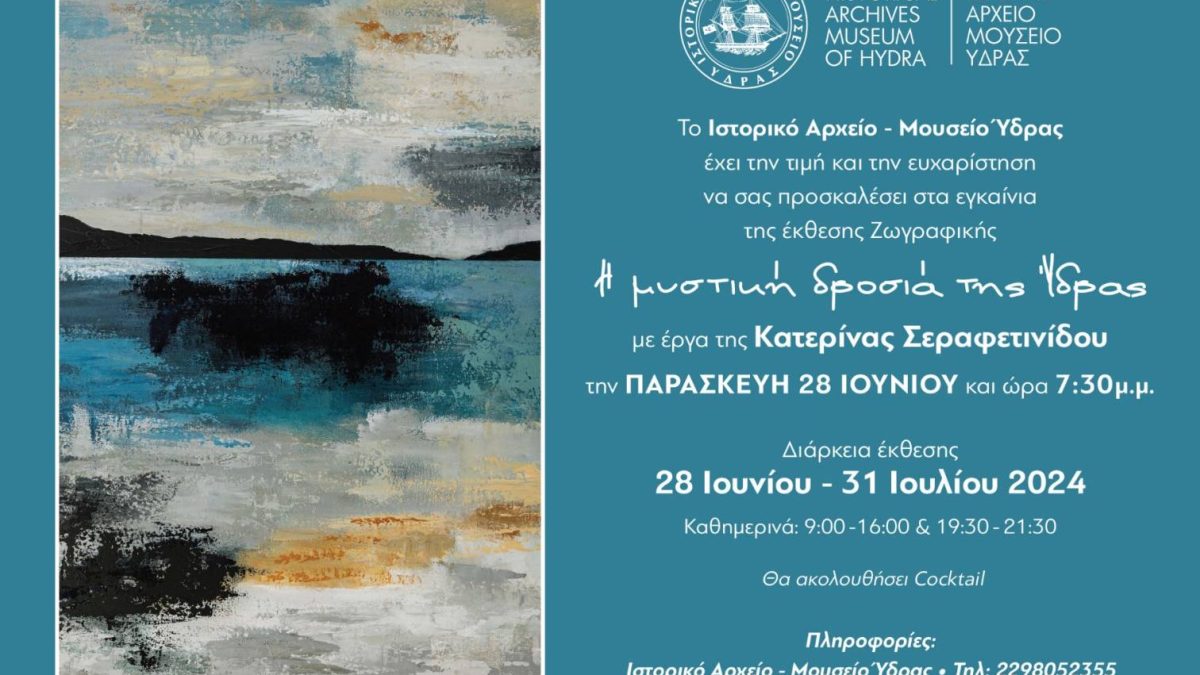 Στο ΓΑΚ/Ιστορικό Αρχείο-Μουσείο Ύδρας θα εγκαινιαστεί η έκθεση της Κατερίνας Σεραφετινίδου με τίτλο Η μυστική δροσιά της Ύδρας, την Παρασκευή 28 Ιουνίου 2024, στις 19:30.