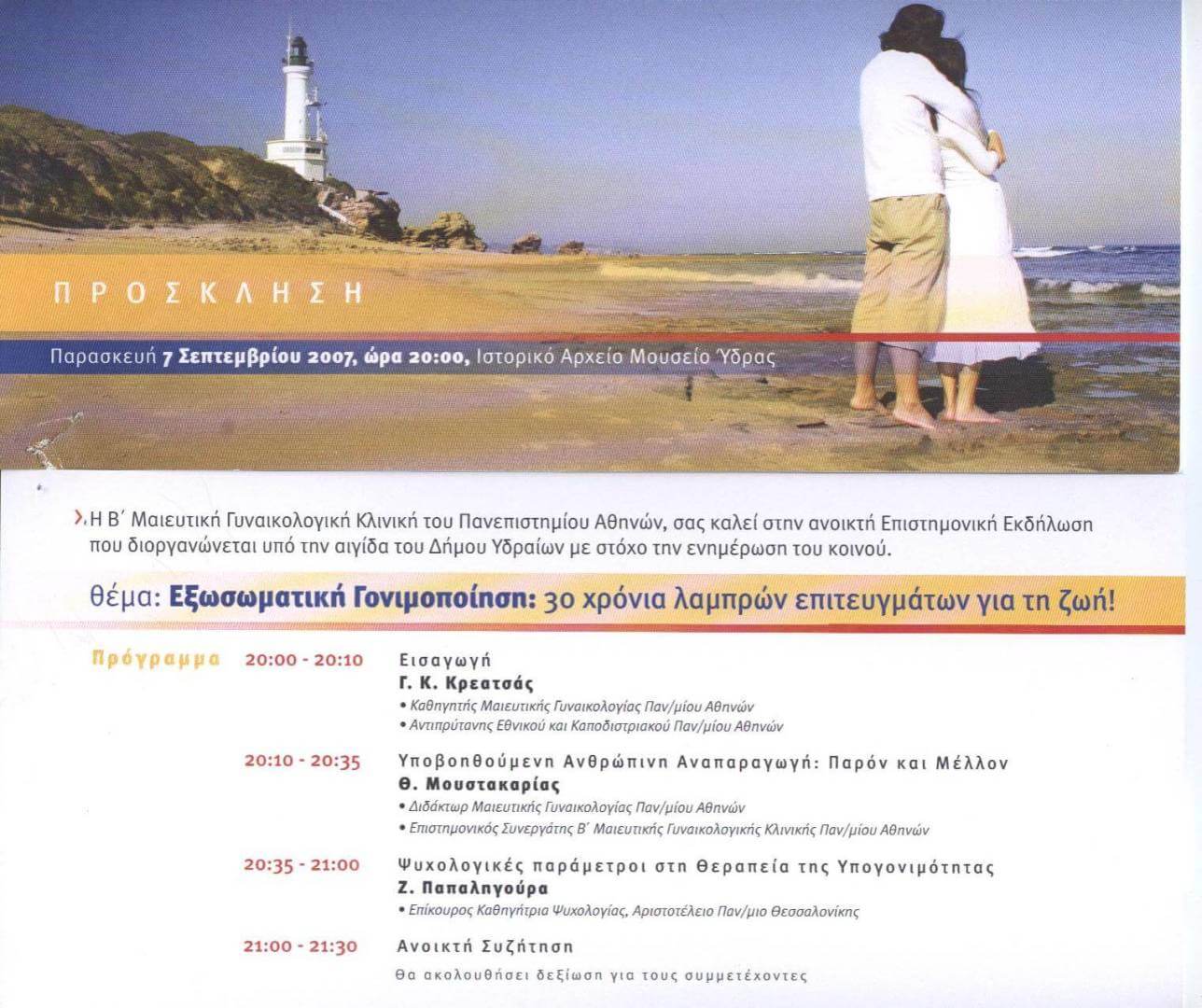 4 Νοεμβρίου, 2014Ιατρικό Συνέδριο «Εξωσωματική Γονιμοποίηση: 30 χρόνια λαμπρών επιτευγμάτων για τη ζωή» (ομιλητές: 1) Γ.Κ. ΚΡΕΑΤΣΑΣ (καθηγητής Μαιευτικής Γυναικολογίας Παν/μιου Αθηνών, Αντιπρύτανης Εθνικού & Καποδιστριακού Παν/μιου Αθηνών), 2) Θ. ΜΟΥΣΤΑΚΑΡΙΑΣ (Διδάκτωρ Μαιευτικής Γυναικολογίας Παν/μίου Αθηνών, Επιστημονικός Συνεργάτης Β’ Μαιευτικής Γυναικολογικής Κλινικής Παν/μίου Αθηνών. 3) Ζ. ΡΑΛΛΗ-ΠΑΠΑΛΗΓΟΥΡΑ (Επίκουρος Καθηγήτρια Ψυχολογίας, Αριστοτέλειο Παν/μιο Θεσσαλονίκης.