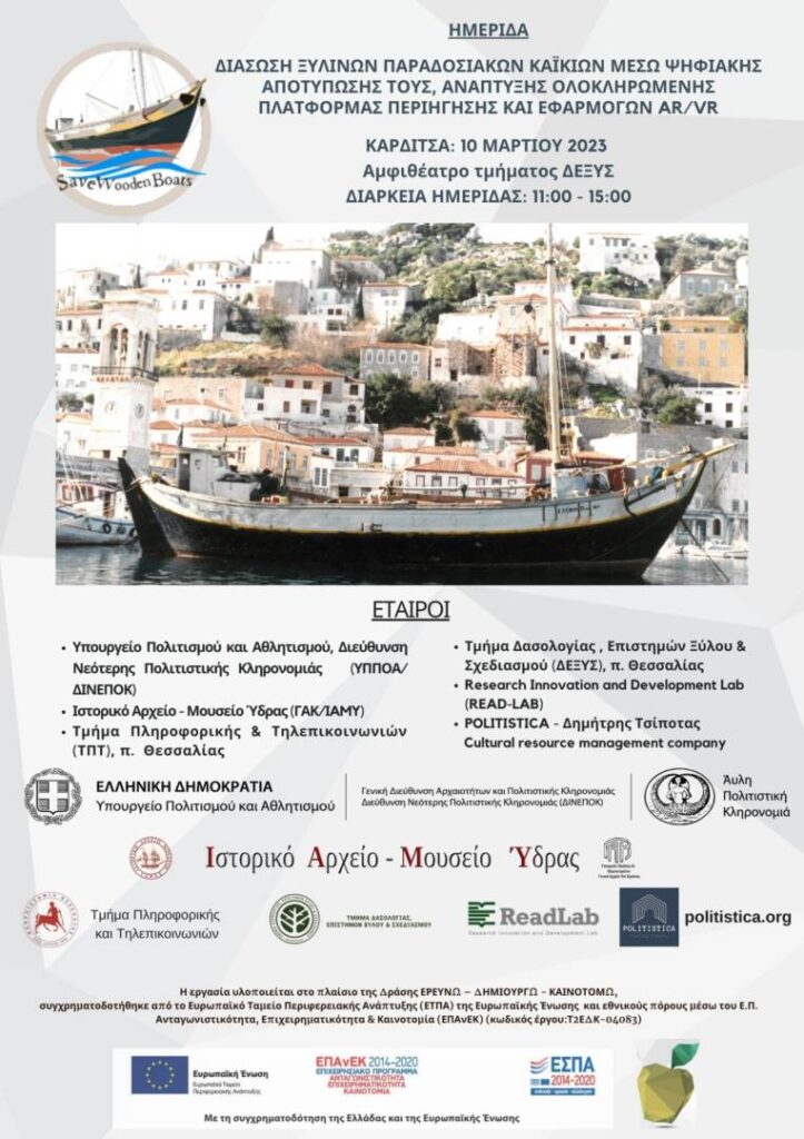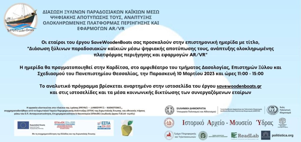 Οι εταίροι του έργου SaveWoodenBoats σας προσκαλούν στην επιστημονική ημερίδα με τίτλο,”Διάσωση ξύλινων παραδοσιακών καϊκιών μέσω ψηφιακής αποτύπωσης τους, ανάπτυξης ολοκληρωμένης πλατφόρμας περιήγησης και εφαρμογών AR/VR”,