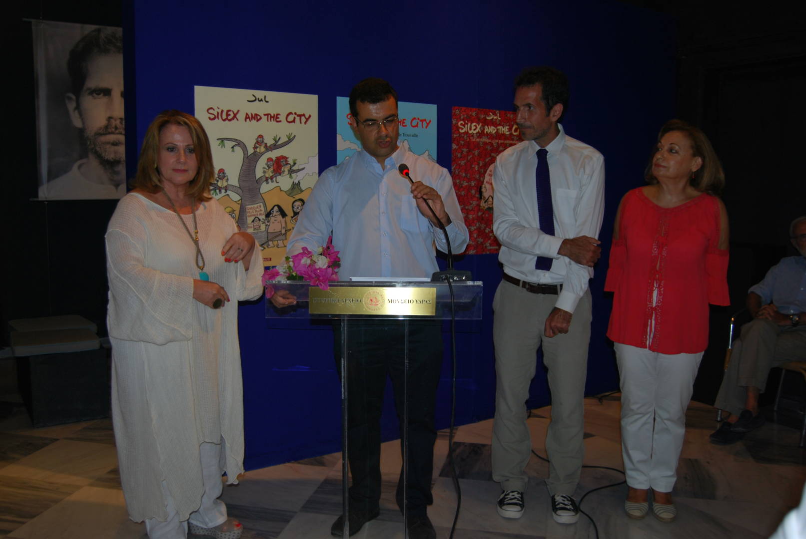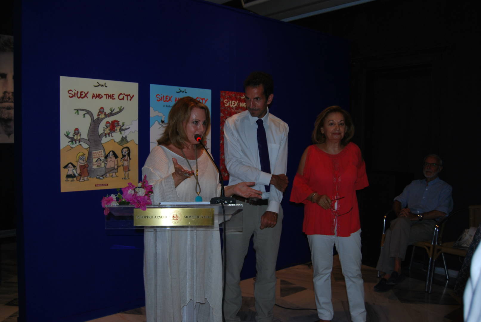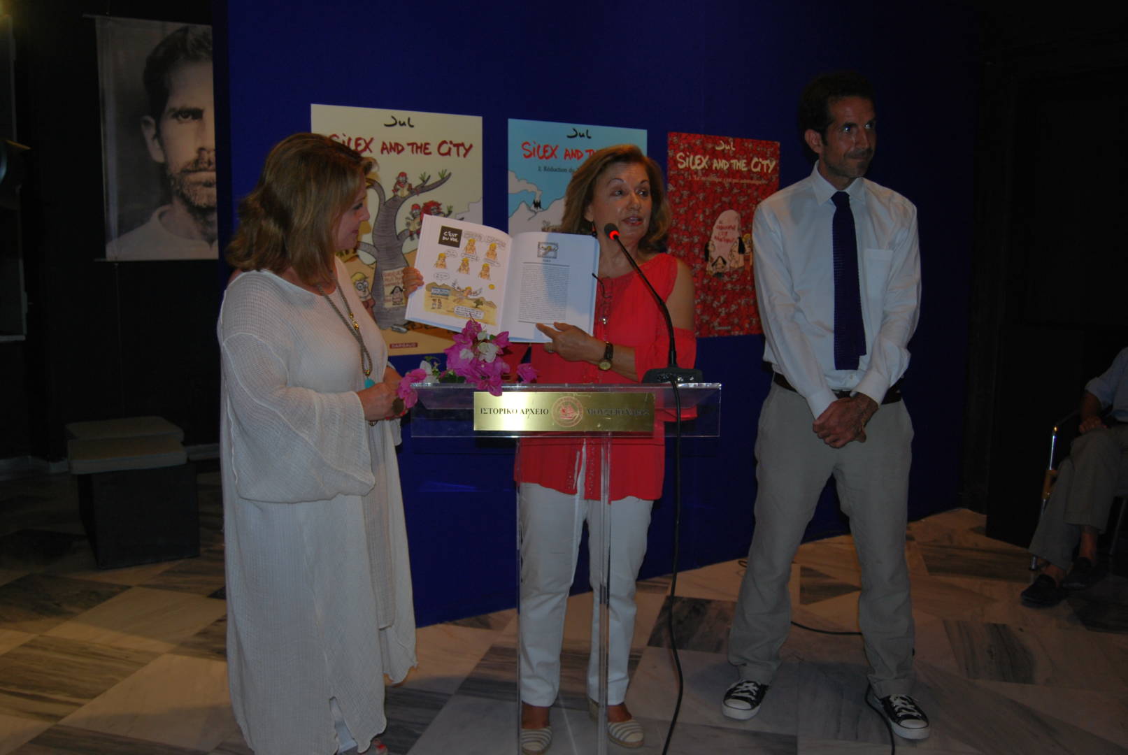 Στα εγκαίνια της έκθεσης η Διευθύντρια του Μουσείου Ύδρας Ντίνα Αδαμοπούλου, αφού καλωσόρισε τους πολυπληθείς επισκέπτες, Έλληνες και Γάλλους, παρουσίασε στο κοινό το προφίλ του JUL. Στην συνέχεια το λόγο έλαβε η φίλη εκπαιδευτικός κ. Θεοδώρα Σωτηροπούλου αναφέροντας ότι τα κόμικς του προσφέρουν διασκέδαση αλλά και γνώση. Επίσης αναφέρθηκε και στην μακρόχρονη φιλία της με την οικογένεια του JUL αλλά και στην ιδιαίτερη αγάπη του Καλλιτέχνη για την Ελλάδα και κάθε τι ελληνικό.