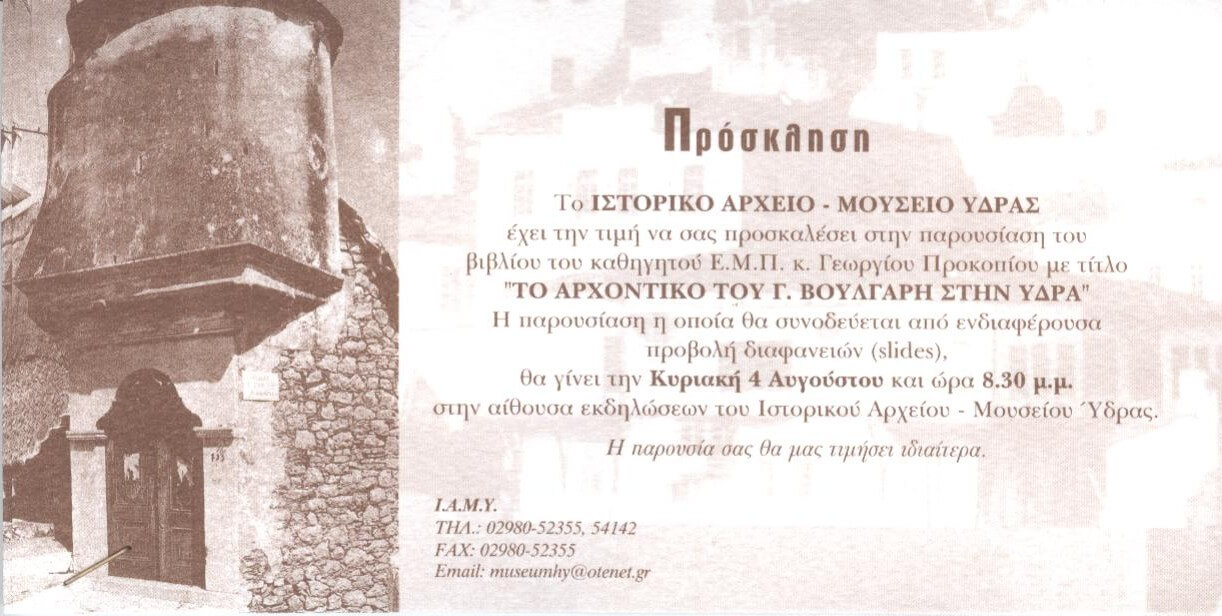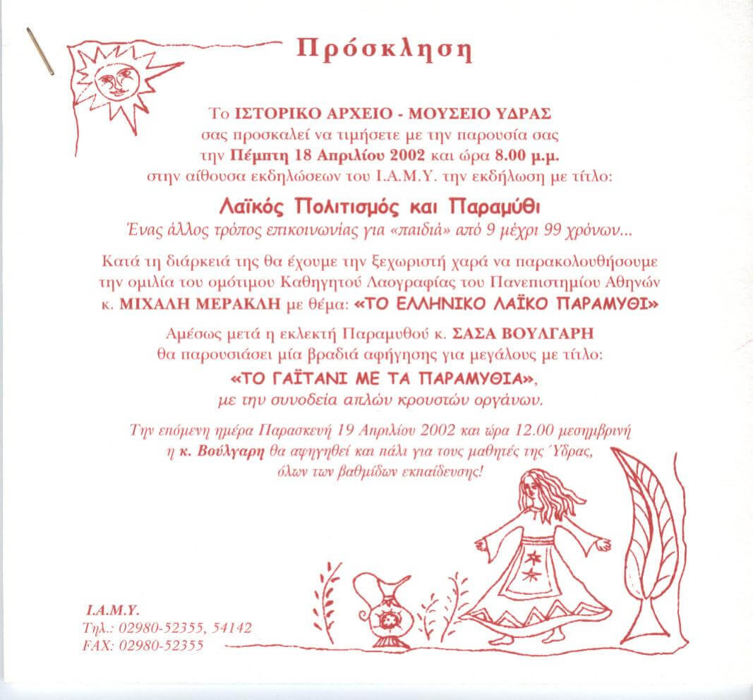 Διάλεξη του ΑΝΑΣΤΑΣΙΟΥ ΚΟΝΤΟΥ, Διευθυντή του Ναυτικού Μουσείου Κρήτης, με θέμα: «Η ΖΩΗ ΣΕ ΈΝΑ ΙΣΤΙΟΦΟΡΟ ΤΟΥ 1700»3 Νοεμβρίου, 2014Παρουσίαση του βιβλίου του Καθηγητού Ε.Μ.Π. Γεωργίου Προκοπίου με τίτλο: «ΤΟ ΑΡΧΟΝΤΙΚΟ ΤΟΥ Γ. ΒΟΥΛΓΑΡΗ ΣΤΗΝ ΥΔΡΑ»3 Νοεμβρίου, 2014 Published by efstraatios at 3 Νοεμβρίου, 2014 Categories 2002 Διάφορα Αρχειο Διάφορες Εκδηλώσεις Tags «Λαϊκός Πολιτισμός και Παραμύθι» Ομιλία του ομότιμου καθηγητού Λαογραφίας του Πανεπιστημίου Αθηνών Μιχάλη Μερακλή με θέμα το «Ελληνικό Λαϊκό Παραμύθι» Αφήγηση παραμυθιών από την Σάσα Βούλγαρη με τίτλο «Το Γαϊτάνι με τα παραμύθια» Πέμπτη, 18 ΑΠΡΙΛΙΟΥ 2002 Share0 efstraatios Related posts20 Ιουνίου, 2024Έκθεση Κατερίνας Σεραφετινίδου – Η μυστική δροσιά της ΎδραςRead more5 Ιουνίου, 2024Πρόγραμμα Εκδηλώσεων για το ΠΟΛΙΤΙΣΤΙΚΟ ΚΑΛΟΚΑΙΡΙ 2024 Read more14 Δεκεμβρίου, 2022Συμμετοχή των ΓΑΚ / ΙΑΜΥ στις Επετειακές Εκδηλώσεις για τον Άγιο Διονύσιο στην ΑίγιναRead more Αφήστε μια απάντηση Ακύρωση απάντησηςΓια να σχολιάσετε πρέπει να συνδεθείτε.