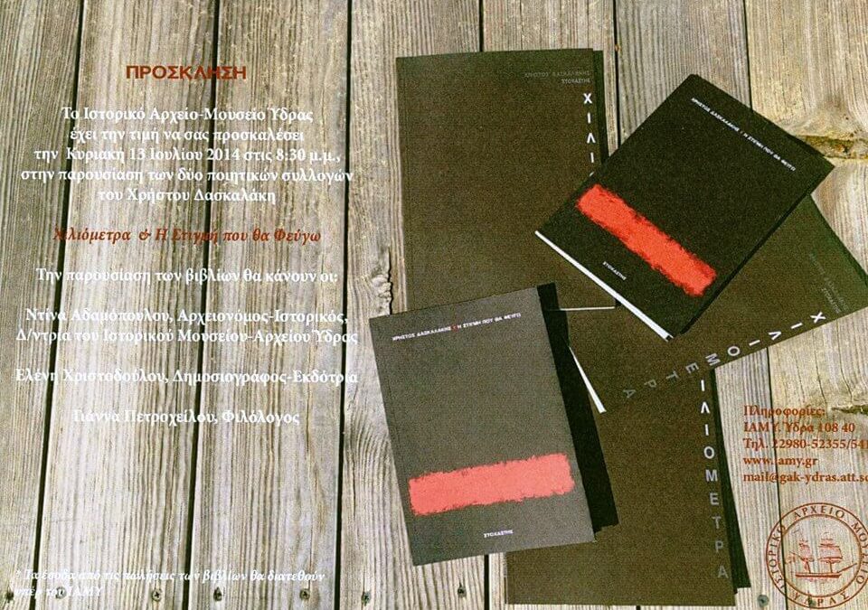 Το Ιστορικό Αρχείο Μουσείο Ύδρας έχει την τιμή να σας προσκαλέσει την Κυριακή 13 Ιουλίου 2014 στις 8.30 μ.μ., στην παρουσίαση των δύο ποιητικών συλλογών του Χρήστου Δασκαλάκη