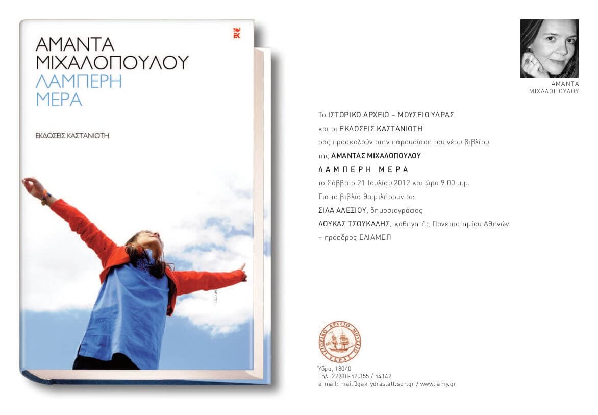 12 Νοεμβρίου, 2014Το Ιστορικό Αρχείο – Μουσείο Ύδρας και οι Εκδόσεις Καστανιώτη σας προσκαλούν στην παρουσίαση του νέου βιβλίου της Αμάντας Μιχαλοπούλου “ΛΑΜΠΕΡΗ ΜΕΡΑ”.