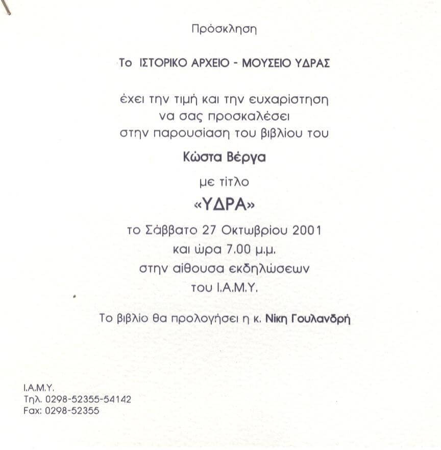 Διάλεξη με θέμα «Το EURO στη ζωή μας».3 Νοεμβρίου, 2014Μουσική βραδιά «ΠΡΟΣ ΝΕΑ ΓΗ» με την ΝΕΝΑ ΒΕΝΕΤΣΑΝΟΥ3 Νοεμβρίου, 2014 Published by efstraatios at 3 Νοεμβρίου, 2014 Categories 2001 Παρουσιάσεις Βιβλίων Παρουσιασεις Βιβλιων Αρχειο Tags Παρουσίαση του βιβλίου «ΥΔΡΑ» του Κώστα Βέργα Σάββατο 27 ΟΚΤΩΒΡΙΟΥ 2001 Share0 efstraatios Related posts1 Σεπτεμβρίου, 2022«ΦΙΛΙΑ, Η ΛΟΓΟΤΕΧΝΙΑ ΤΗΣ ΥΔΡΑΣ»Read more5 Ιουλίου, 2022Παρουσίαση βιβλίου Ίριδας ΠαναγιωτοπούλουRead more28 Ιουνίου, 2022EΠΕΤΕΙΑΚΗ ΟΜΙΛΙΑ – ΣΥΖΗΤΗΣΗ ΣΤΟ Ι.Α.Μ.Υ.Read more Αφήστε μια απάντηση Ακύρωση απάντησηςΓια να σχολιάσετε πρέπει να συνδεθείτε.