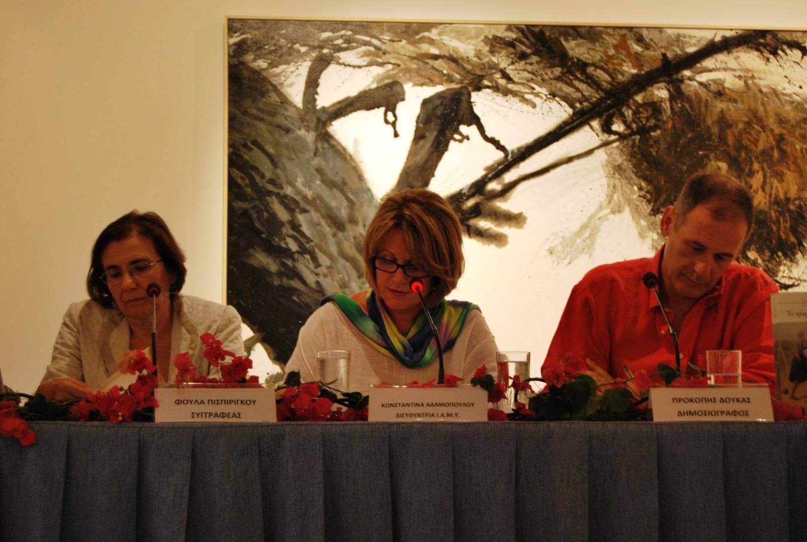 - Από αριστερά: Η συγγραφέας κα. Φούλα Πισπιρίγκου, η Προϊσταμένη του ΙΑΜΥ κα. Κωνσταντίνα Αδαμοπούλου και ο Δημοσιογράφος της Ε.Ρ.Τ. Προκόπης Δούκας