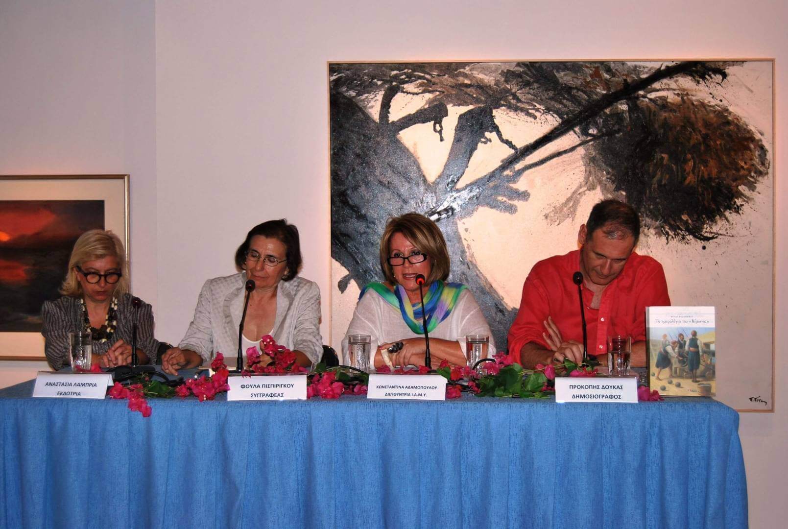 - Από αριστερά: Η εκδότης Αναστασία Λαμπρια, η συγγραφέας κα. Φούλα Πισπιρίγκου, η Προϊσταμένη του ΙΑΜΥ κα. Κωνσταντίνα Αδαμοπούλου και ο Δημοσιογράφος της Ε.Ρ.Τ. Προκόπης Δούκας