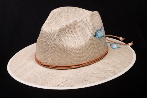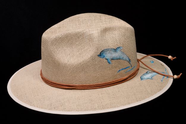 Panama straw hat hand painted with dolphin design.