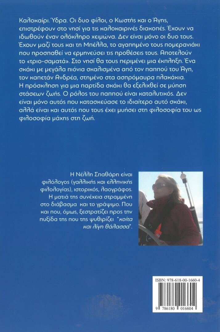 Καλοκαίρι. Ύδρα. Οι δυο φίλοι, ο Κωστής και ο Άγης, επιστρέφουν στο νησί για τις καλοκαιρινές διακοπές. Έχουν να ιδωθούν έναν ολόκληρο χειμώνα. Δεν είναι μόνο οι δυο τους. Έχουν μαζί τους και τη Μπέλλα, το αγαπημένο τους πομερανιάκι που προσπαθεί να ερμηνεύσει τις προθέσεις τους. Αποτελούν το «τριο-σαματά». Στο νησί θα τους περιμένει μια έκπληξη. Ένα σκάκι με μεγάλα πιόνια σκαλισμένα από τον παππού του Άγη, τον καπετάν Ανδρέα, στημένο στα ασπρόμαυρα πλακάκια. Η πρόσκληση για μια παρτίδα σκάκι θα εξελιχθεί σε μύηση στάσεων ζωής.Ο ρόλος του παππού είναι καταλυτικός. Δεν είναι μόνο αυτός που κατασκεύασε το ιδιαίτερο αυτό σκάκι, αλλά είναι και αυτός που τους έχει μυήσει στη φιλοσοφία του ως φιλοσοφία μάχης στη ζωή.