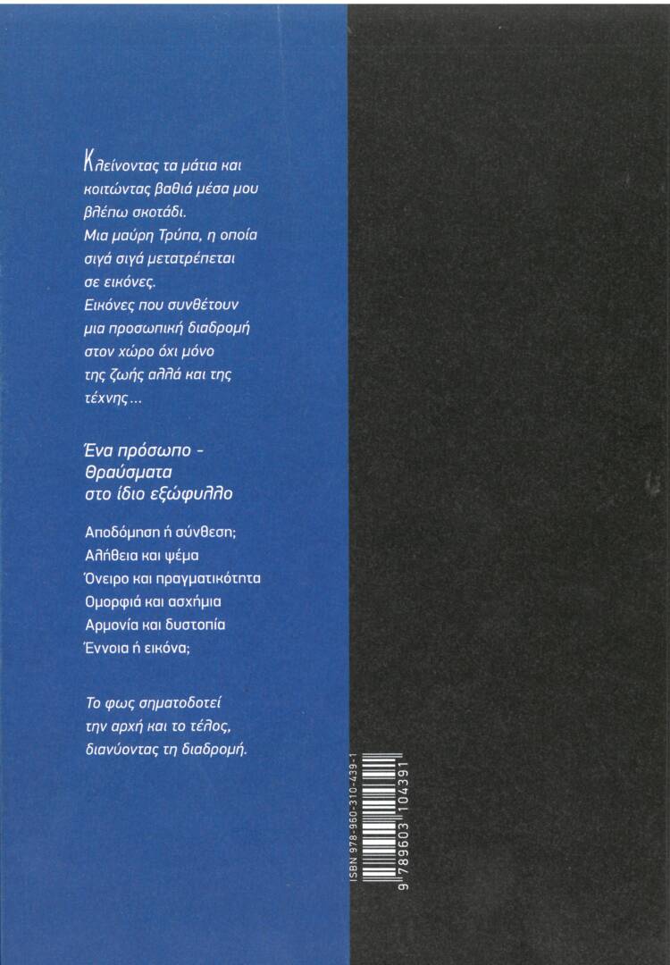 Κλείνοντας τα μάτια και κοιτώντας βαθιά μέσα μου, βλέπω σκοτάδι. Μια μαύρη τρύπα, η οποία σιγά σιγά μετατρέπεται σε εικόνες. Εικόνες που συνθέτουν μια προσωπική διαδρομή στον χώρο όχι μόνο της ζωής αλλά και της τέχνης…