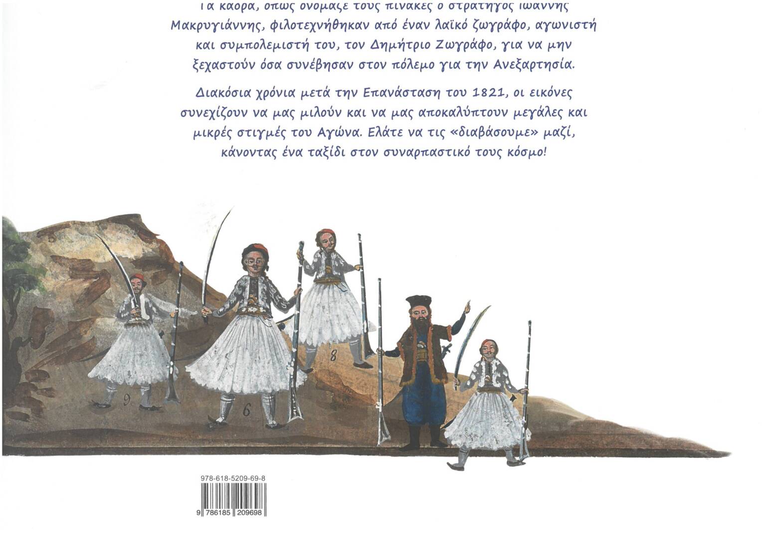 Είκοσι τέσσερις πολύχρωμες εικόνες με εκατοντάδες πολεμιστές, άλογα, κανόνια, κάστρα και χωριά, κάμπους, βουνά, ποτάμια και θάλασσες γεμάτες καράβια, νησιά και λιμάνια. Είναι εικόνες μαχών που αφηγούνται γεγονότα της Επανάστασης από το 1821 που ξεκίνησε μέχρι την ανεξαρτησία της Ελλάδας, το 1830.Τα κάδρα, όπως ονόμαζε τους πίνακες ο στρατηγός Ιωάννης Μακρυγιάννης, φιλοτεχνήθηκαν από έναν λαϊκό ζωγράφο, αγωνιστή και συμπολεμιστή του, τον Δημήτριο Ζωγράφο, για να μην ξεχαστούν όσα συνέβησαν στον πόλεμο για την Ανεξαρτησία.