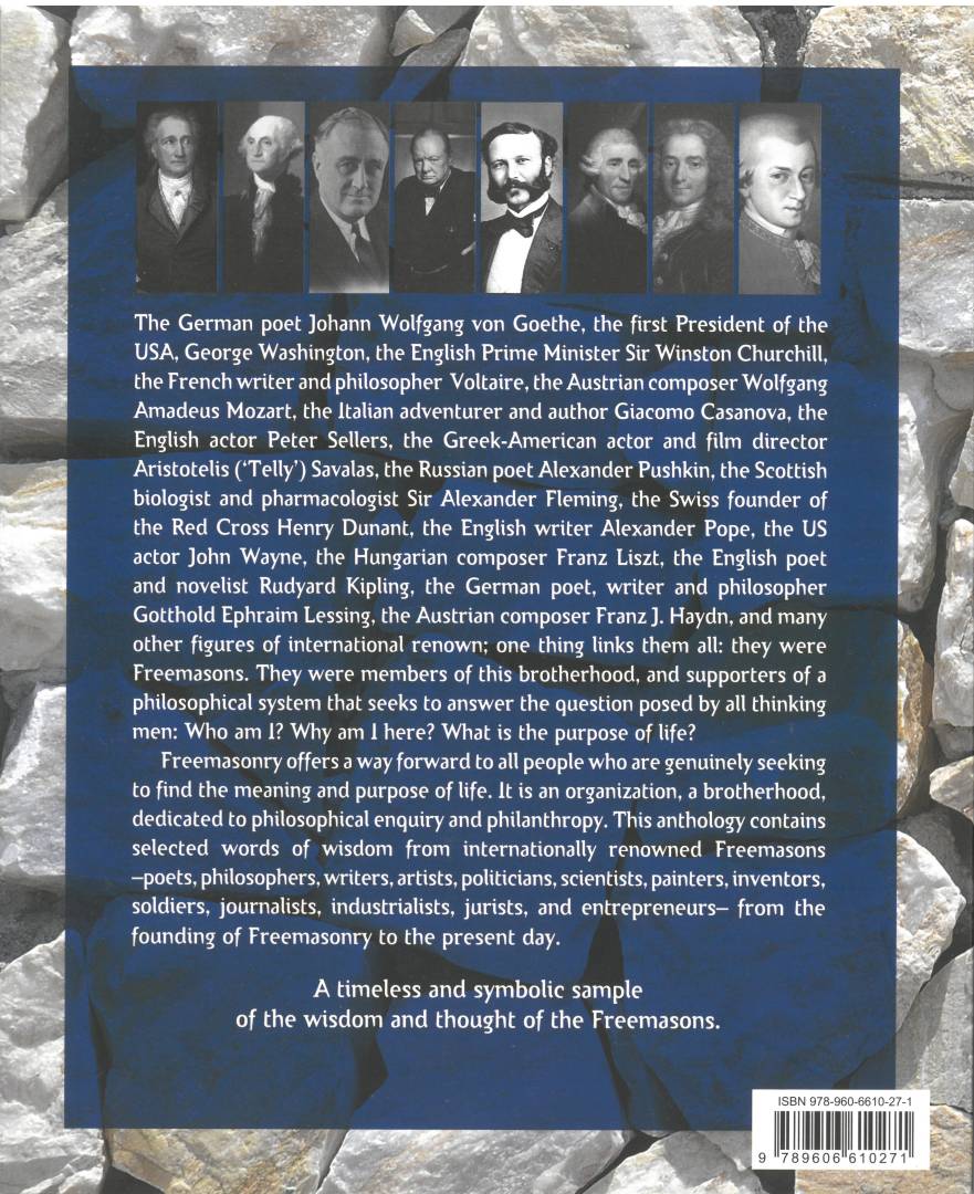 The German poet Johann Wolfgang von Goethe, the first President of the USA, George Washington, the English Prime Minister Sir Winston Churchill, the French writer and philosopher Voltaire, the Austrian composer Wolfgang Amadeus Mozart, the Italian adventurer and author Giacomo Casanova, the English actor Peter Sellers, the Greek-American actor and film director Aristotelis (‘Telly’) Savalas, the Russian poet Alexander Pushkin, the Scottish biologist and pharmacologist Sir Alexander Fleming, the Swiss founder of the Red Cross Henry Dunant, the English writer Alexander Pope, the US actor John Wayne, the Hungarian composer Franz Liszt, the English poet and novelist Rudyard Kipling, the German poet, writer and philosopher Gotthold Ephraim Lessing, the Austrian composer Franz J. Haydn, and many other figures of international renown; one thing links them all: they were Freemasons. They were members of this brotherhood, and supporters of a philosophical system that seeks to answer the question posed by all thinking men: Who am I? Why am I here? What is the purpose of life? Freemasonry offers a way forward to all people who are genuinely seeking to find the meaning and purpose of life. It is an organization, a brotherhood, dedicated to philosophical enquiry and philanthropy. This anthology contains selected words of wisdom from internationally renowned Freemasons -poets, philosophers, writers, artists, politicians, scientists, painters, inventors, soldiers, journalists, industrialists, jurists, and entrepreneurs- from the founding of Freemasonry to the present day.