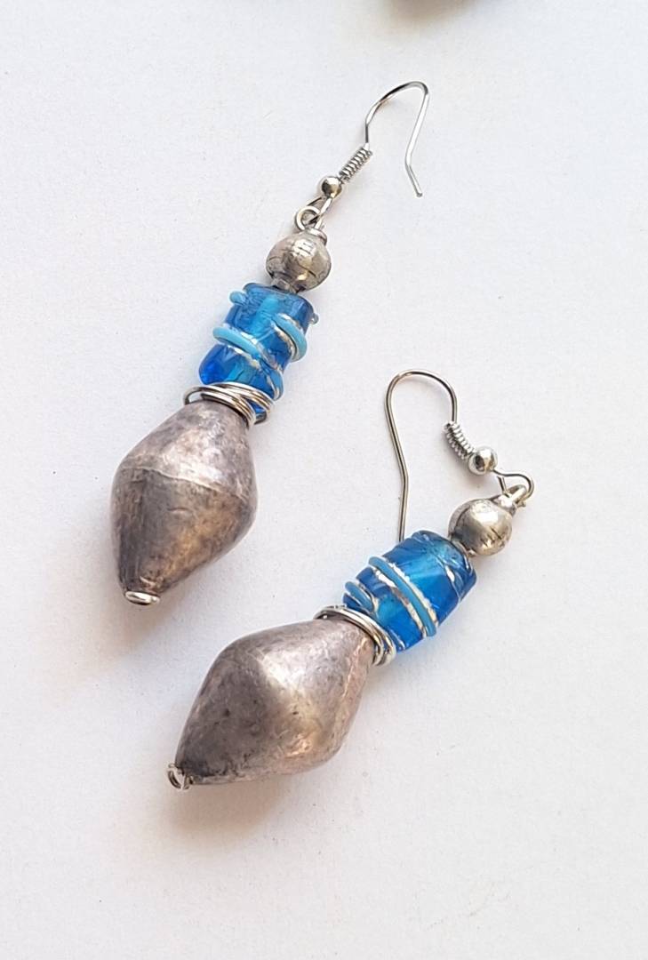 Χειροποίητα κρεμαστά σκουλαρίκια με μεταλλικά στοιχεία και αυθεντικές πέτρες Murano.