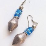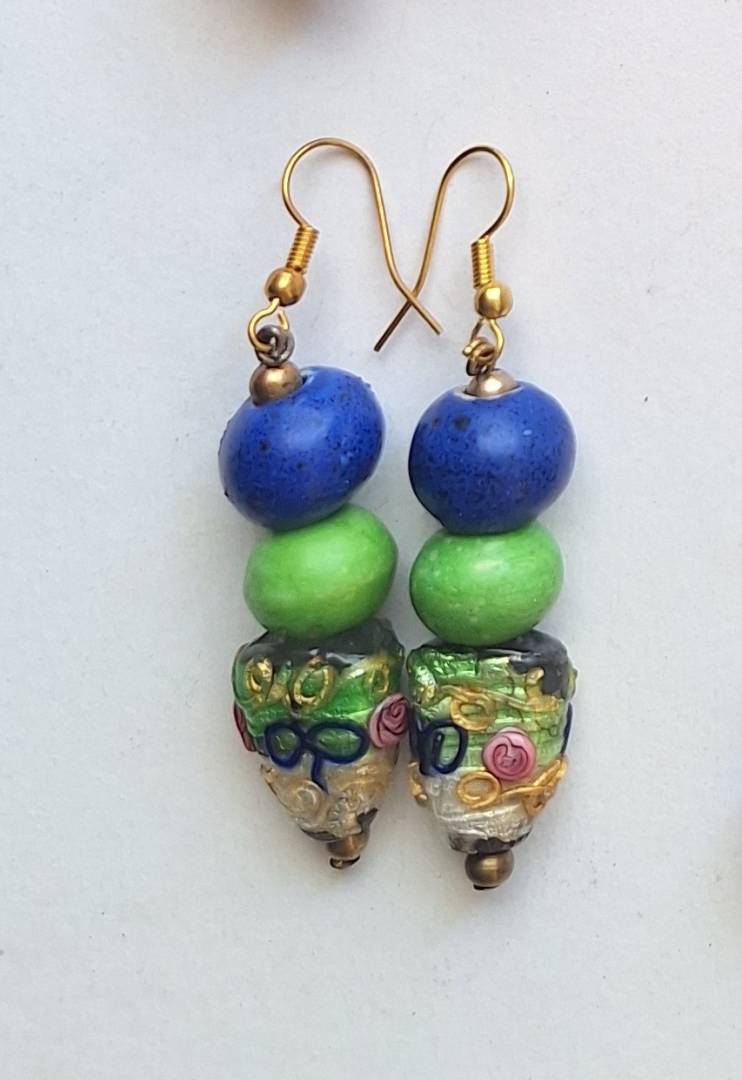 Ασημένια κρεμαστά χειροποίητα σκουλαρίκια με κεραμικές και γυάλινες χάντρες επιζωγραφισμένες.