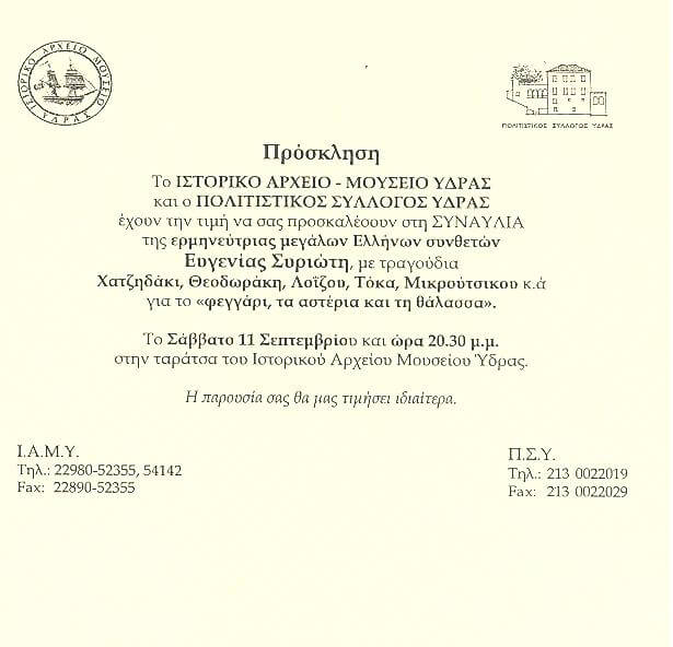 7 Νοεμβρίου, 2014Το Ιστορικό Αρχείο – Μουσείο Ύδρας και ο Πολιτιστικός Σύλλογος Ύδρας έχουν την τιμή να σας προσκαλέσουν στη συναυλία της ερμηνεύτριας μεγάλων Ελλήνων συνθετών Ευγενίας Συριώτη, με τραγούδια Χατζηδάκι, Θεοδωράκη, Λοϊζου, Τόκα, Μικρούτσικου κ.α. για το ”φεγγάρι, τα αστέρια και τη θάλασσα”.