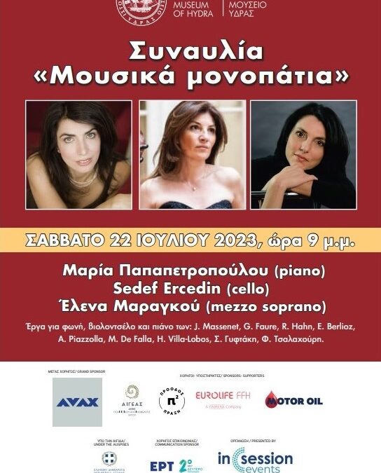 Παρουσίαση βιβλίου του Κωνσταντίνου Πίττα “Η Μοναξιά του Ενός”15 Ιουλίου, 2023Εικαστική Έκθεση με τον τίτλο “Loin Sur La Terre” της Eva Medin και της Στεφανίας Στρούζα από το project HYAM στο Ιστορικό Αρχείο – Μουσείο Ύδρας25 Ιουλίου, 2023 Published by efstraatios at 18 Ιουλίου, 2023 Categories Διάφορες Τρέχουσες Εκδηλώσεις Νέα - Ανακοινώσεις Tags Το Ιστορικό Αρχείο – Μουσείο Ύδρας έχει την χαρά και την τιμή να σας προσκαλέσειστην Συναυλία με τον τίτλο“Μουσικά Μονοπάτια”με τις:Μαρία Παπαπετροπούλου (piano), Sedef Ercedin (cello)Έλένη Μαραγκού (φωνή-mezzo soprano),με εκτέλεση έργων για φωνή, βιολοντσέλο και πιάνο των: J. Massenet, G. Faure, R. Hahn, E. Berlioz, A. Piazzolla, M. De Falla, H. Villa-Lobos, Σ. Γυφτάκη, Φ. Τσαλαχούρητο Σάββατο, 22 Ιουλίου 2023το βράδυ στις 9στην ταράτσα του Μουσείου μαςΕίσοδος Ελεύθερη Share0 efstraatios Related posts18 Ιανουαρίου, 2025ΕΚΘΕΣΗ ΜΟΥΣΕΙΑΚΩΝ ΕΝΘΥΜΗΜΑΤΩΝ & ΑΡΧΕΙΑΚΟΥ ΥΛΙΚΟΥ ΠΡΟΣ ΤΙΜΗΝ ΤΩΝ ΕΥΕΡΓΕΤΩΝ ΤΩΝ ΓΑΚ/ΙΑΜΥ ΔΙΟΝΥΣΙΟΥ & ΙΝΓΚΡΙΝΤ ΚΟΥΝΤΟΥΡΙΩΤΗRead more19 Αυγούστου, 2024ΡΕΣΙΤΑΛ ΠΙΑΝΟΥ ΤΟΥ ΣΗΜΑΝΤΙΚΟΥ ΕΛΛΗΝΑ BIΡΤΟΥΟΖΟΥΠΑΝΑΓΙΩΤΗ ΤΡΟΧΟΠΟΥΛΟΥRead more5 Αυγούστου, 2024ΘΑΝΑΣΗΣ ΛΑΛΑΣ – «Η Ζωή μιας απώλειας»Read more Αφήστε μια απάντηση Ακύρωση απάντησηςΓια να σχολιάσετε πρέπει να συνδεθείτε.