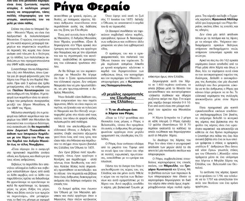 20 Νοεμβρίου, 2021Με την ευκαιρία της μεταφοράς και της Έκθεσης στη Μυτιλήνη της Καρδιάς του Ναυάρχου Ανδρέα Μιαούλη και της Χάρτας του Ρήγα Φεραίου, η Διευθύντρια του Ιστορικού Αρχείου Μουσείου Ύδρας Κωνσταντίνα Αδαμοπούλου παραχώρησε συνέντευξη στην τοπική Εφημερίδα «ΕΜΠΡΟΣ» και στη δημοσιογράφο Ανδρονίκη Κουτσαβλή.